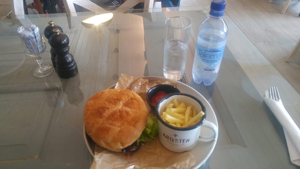Gegessen habe ich eine guten Burger mit Pommes und 0.5 Liter Wasser mit Kohlensäure, sowie einmal Plörre zum abgewöhnen.