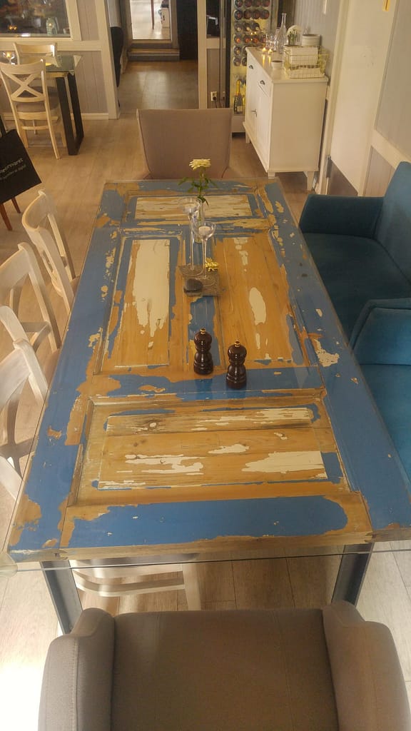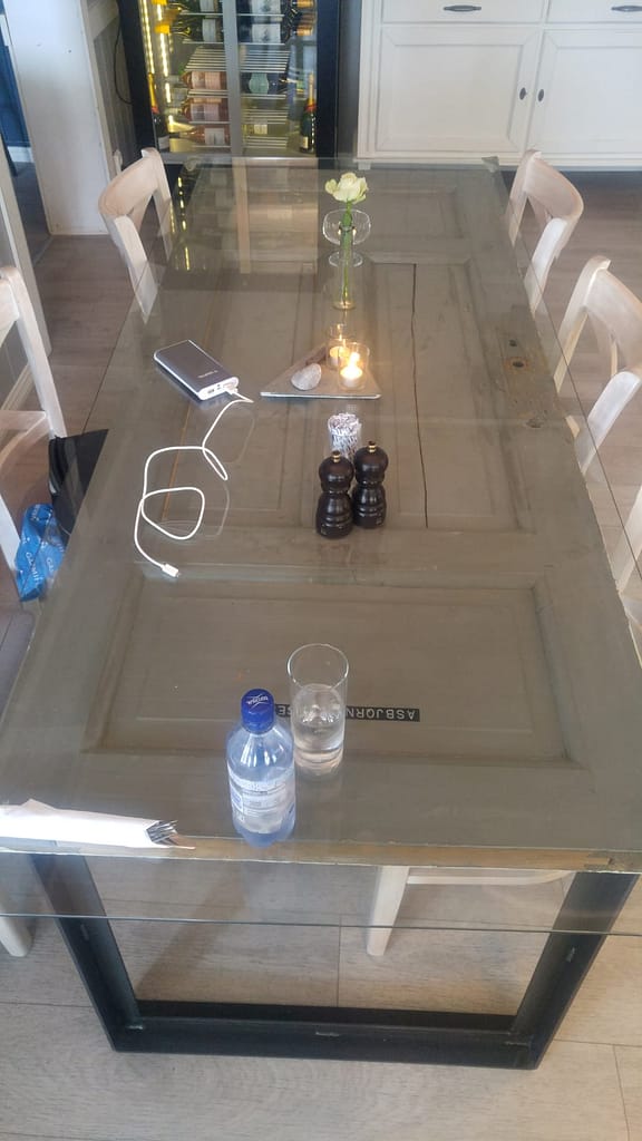 Als Fun Fact kann ich vermelden, dass die Tische alte Türblätter mit einer Glasscheibe sind.