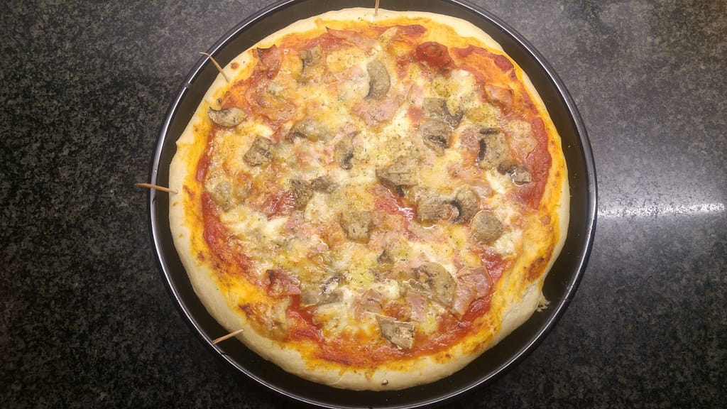 Mit passierten Tomaten, Mozzarella, Schinken, Champigons, Gorgonzola, Parmesan, Olivenöl, Salz und Organo (Peffer erst nach dem backen).