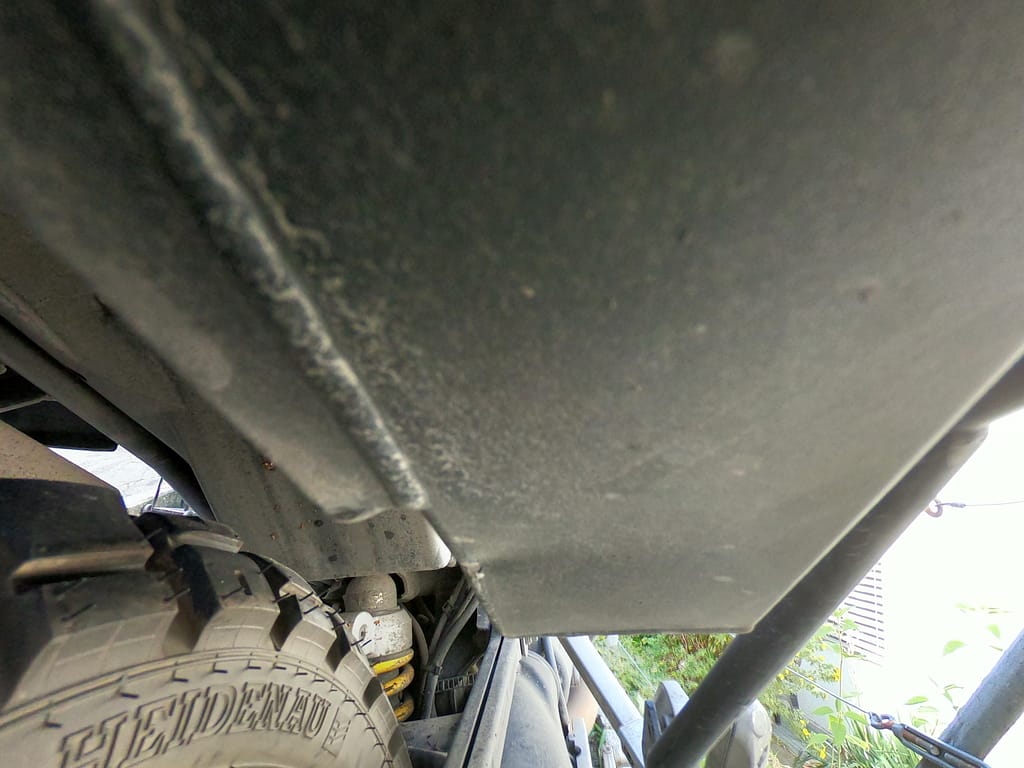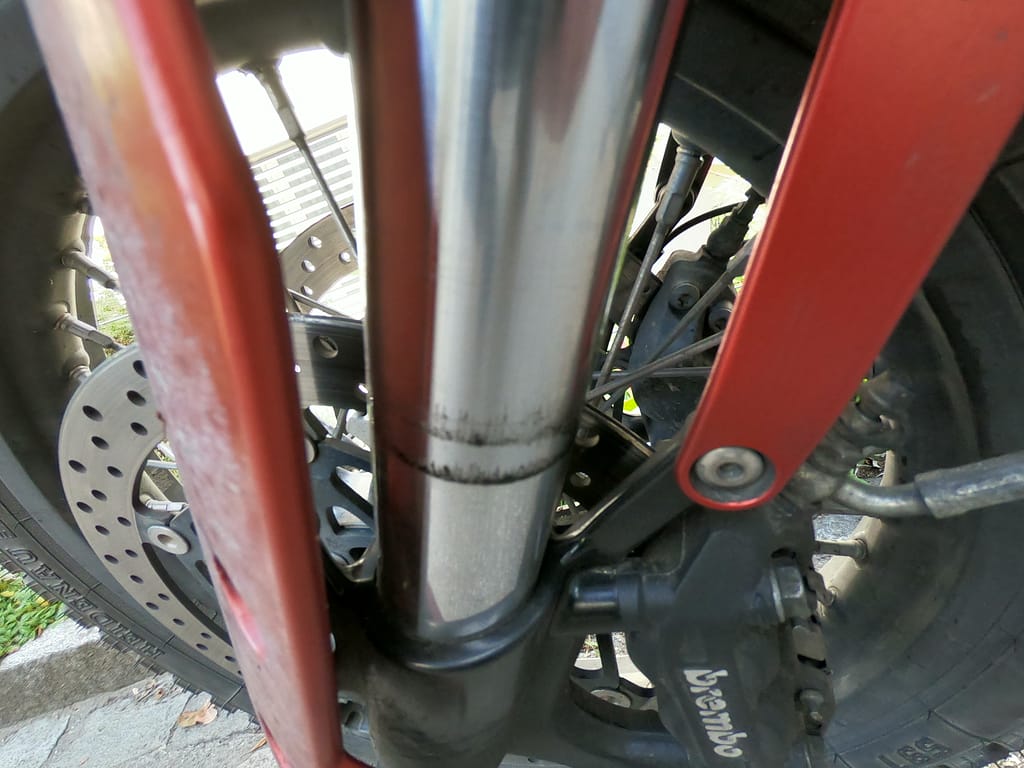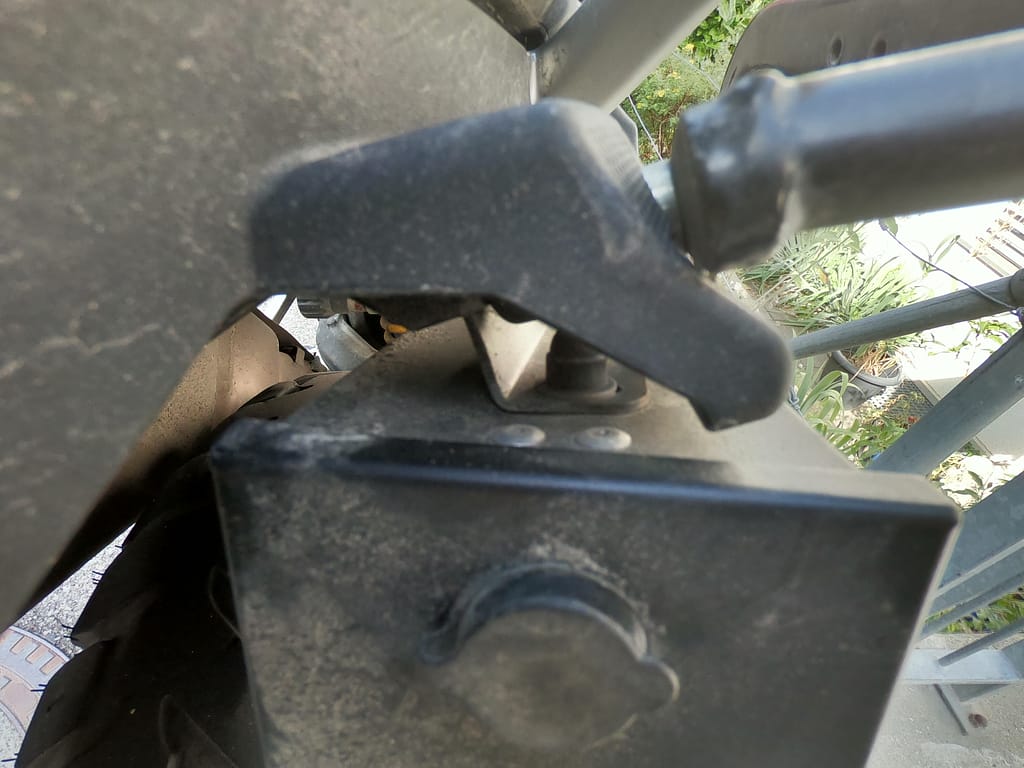 Gleich noch der Diva unter den Rock geschaut. Die Toolbox hat sich tatsächlich verbogen, da die Federung mal zu fest eingefedert hat. Das passierte beim Bierunfall.
